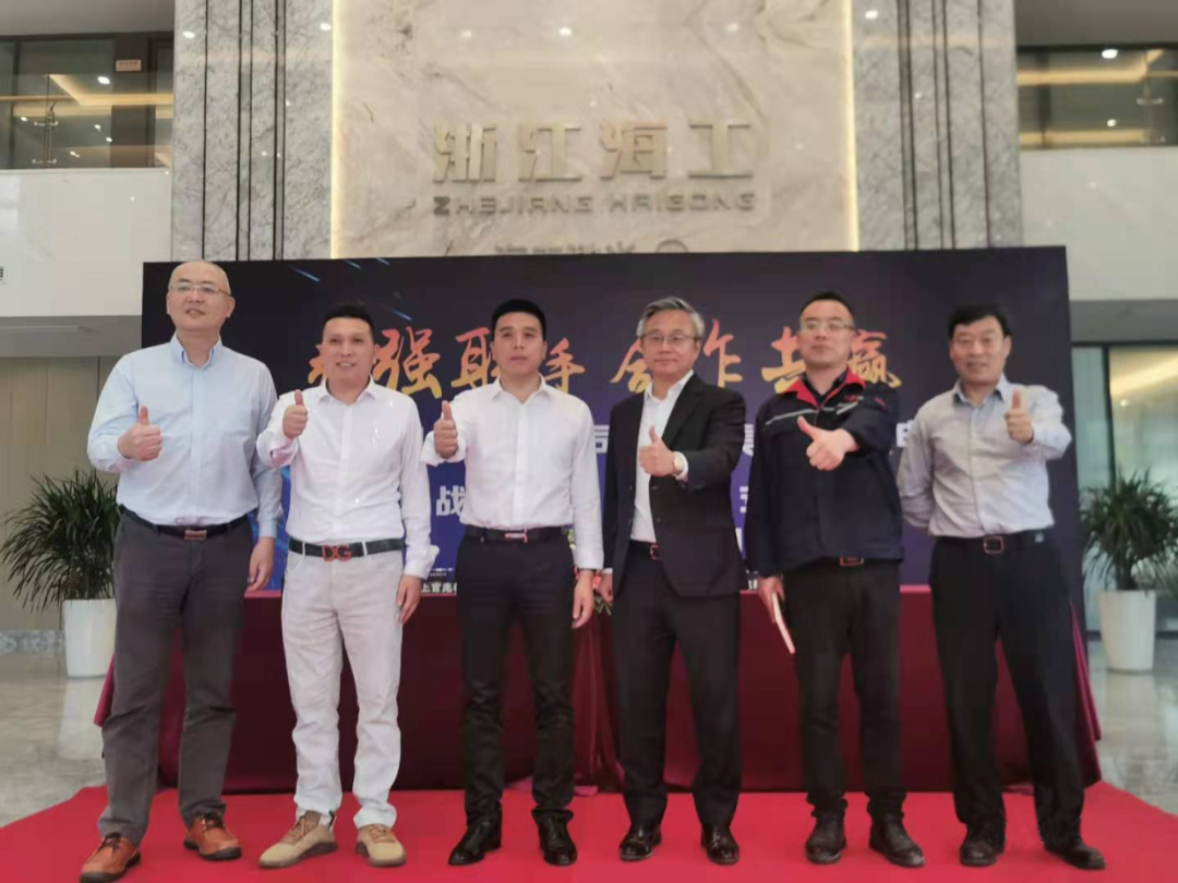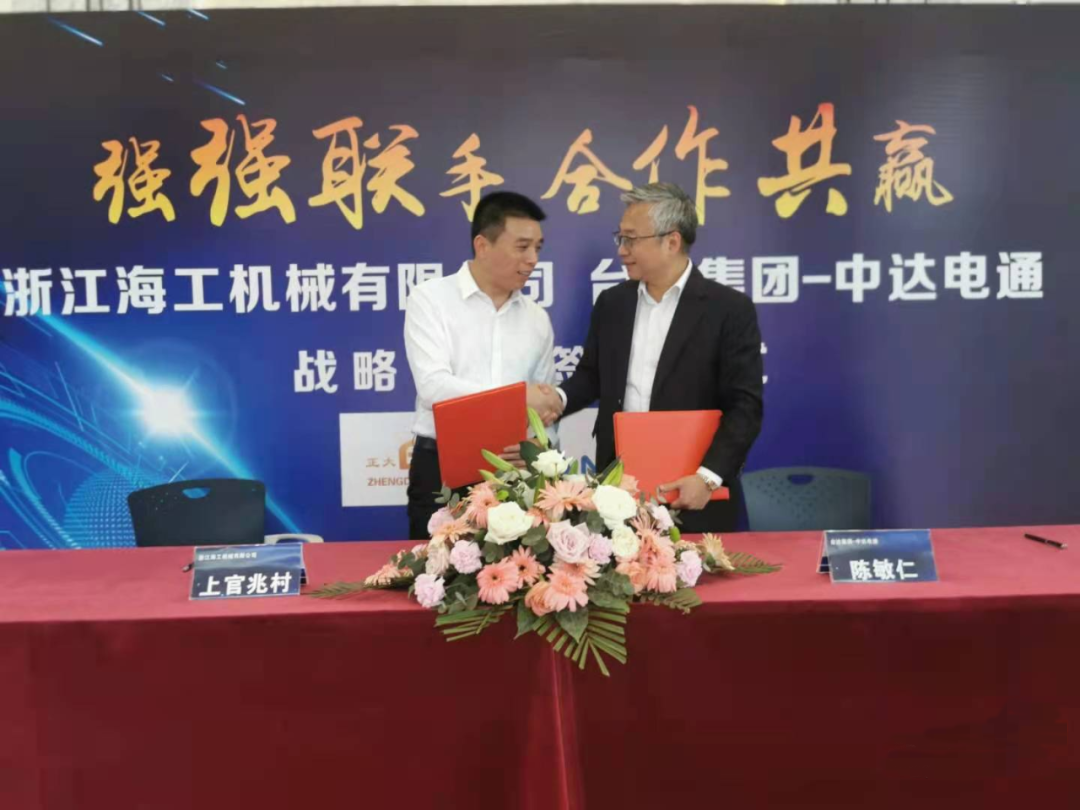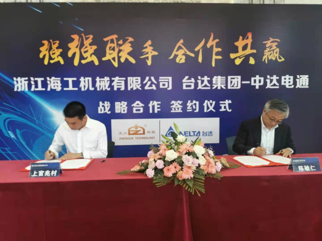 機械與工控強強聯(lián)手,海工與臺達合作共贏。4月23日,浙江海工機械一樓大廳熱鬧非凡,海工機械總經(jīng)理上官兆村與臺灣臺達集團-中達電通機電事業(yè)部總經(jīng)理陳敏仁在此簽訂戰(zhàn)略合作協(xié)議。