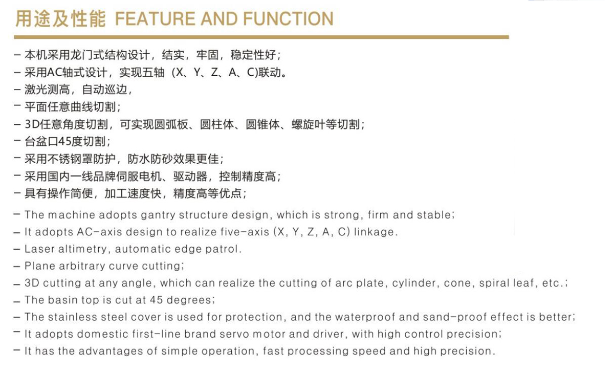 X軸3800mm;Y軸2000mm;Z軸120mm;A軸±66°;C軸無限旋轉(zhuǎn)